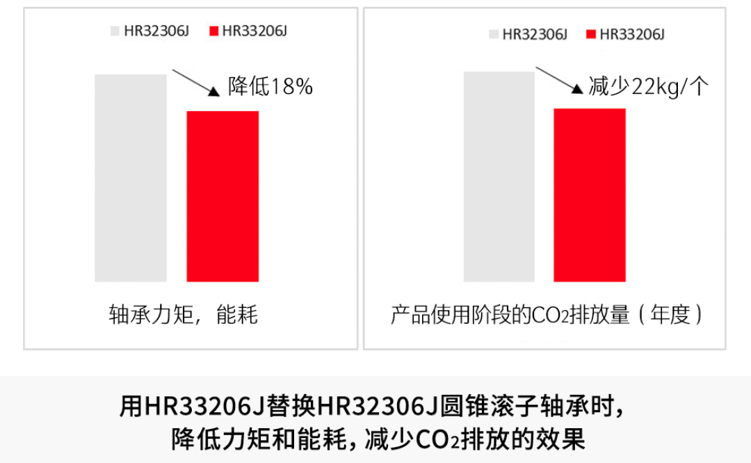 例:圓錐滾子軸承HR32306J可用較小的HR33206J代替。據(jù)估計(jì),更換后軸承力矩和能耗可降低約18%,在產(chǎn)品使用階段每年可節(jié)約電能*4 約48kWh,相當(dāng)于減少CO2排放量*4 約22kg。