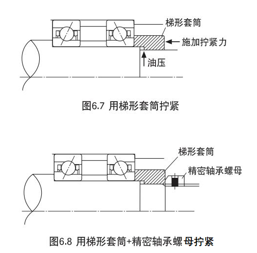 梯形套筒將因油壓而膨脹的套筒插到軸上,施加所需的壓入力(擰緊力)后,除去油壓,在將套筒固定在軸上的同時(shí)向軸承施加抒緊力,是一種比較容易的固定方法。