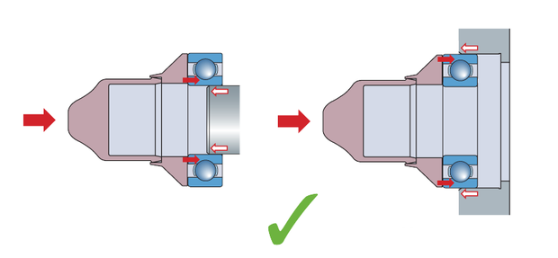 大部分軸承都采用壓入法進(jìn)行安裝。如果要將軸承的內(nèi)外圈同時(shí)裝到軸上和軸承座中,必須確保以相同的壓力同時(shí)作用在內(nèi)外圈上,且必須與安裝工具接觸面在同一平面上。