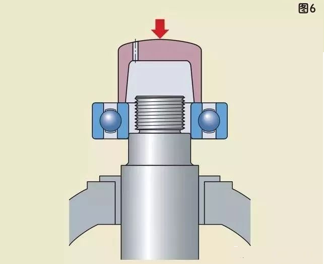 安裝內(nèi)圈過(guò)盈配合的軸承時(shí),不能通過(guò)外圈和滾動(dòng)體把力傳遞給內(nèi)圈。這會(huì)把軸承滾道和滾動(dòng)體表面敲壞,使軸承在運(yùn)轉(zhuǎn)時(shí)產(chǎn)生噪音并提前損壞。正確的方法應(yīng)該用套筒直接把力作用在內(nèi)圈端面上。